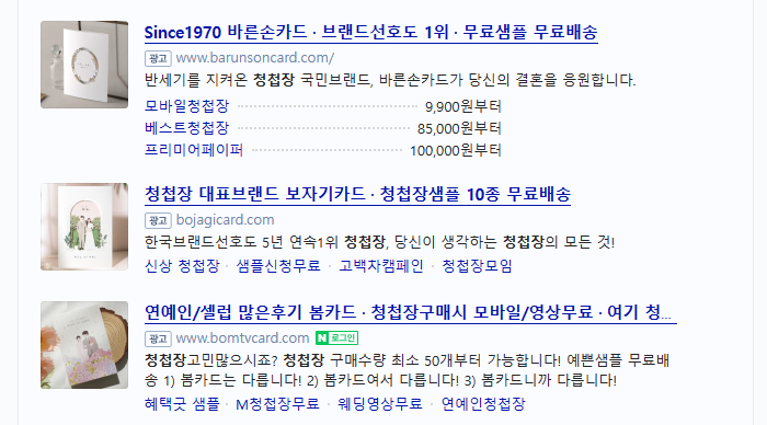 주변에 결혼한 친구들이나 웨딩 준비 카페에서 보니 청첩장 제작 업체 홈페이지에 가면 샘플을 신청할 수 있더라구요. 청첩장 제작사가 이렇게 많은지도 몰랐습니다.