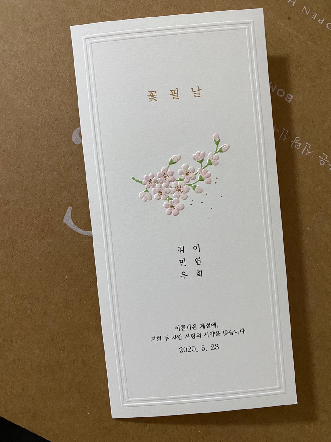 받은 청첩장 카드가 다 매력적이라 고민이 많았습니다. 나름 고심끝에 선택한 청첩장은 바른손카드에서 만든 벚꽃이 그려진 카드였어요. 4월에 예식이라 결혼 시기와도 잘 맞는 것 같고, 심플해서 고르게 되었습니다. 하지만.. 바른손카드 홈페이지에서 아무리 찾아봐 없었고 문의해 본 결과 해당 카드는 준비된 재고가 없다는 답변을 받았습니다.