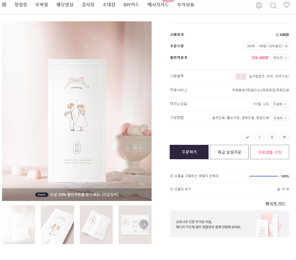 주변에 결혼한 친구들이나 웨딩 준비 카페에서 보니 청첩장 제작 업체 홈페이지에 가면 샘플을 신청할 수 있더라구요. 청첩장 제작사가 이렇게 많은지도 몰랐습니다.